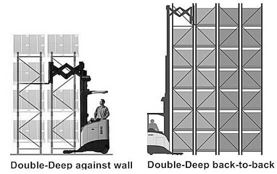 The racks are designed with nearly double the depth of the selective pallet rack to accommodate two pallets in depth which mean pallets of the same SKU must be stored in every location. A special forklift lift with a special telescopic fork or a pantograph fork attachment must be used with this system in order to reach the pallet stored in the behind. Double Deep is a LIFO system which can increase the storage capacity from 10- 15 % based on the layout design.