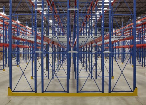 Double deep pallet rack is similar to selective racking; but pallets are stored two rows deep instead of one row. The most common forklift used for double-deep handing is a reach truck. Double deep pallet racking stores 2 pallets deep or 4 pallets deep between aisles. It delivers increased storage density when compared to wide aisle and requires specialized fork lift trucks. Double deep pallet rack simply has one row of standard pallet racking behind another. Using a deep reach lift truck, the operator places the back pallet into the system first, and then places another pallet in front of it. Selectivity is reduced by 30% over standard pallet rack, but 30% more pallets are stored for a given number of aisles. This increases productive use of floor space over a wide aisle system, offering the same sort of utilization as narrow aisle. Double deep pallet racking offers low initial cost, high productivity, and good selectivity.